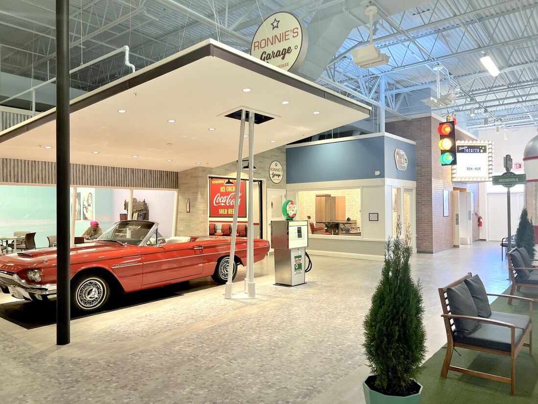 Town Square Sandy Springs is an immersive adult day center designed for those in need of memory or cognitive care, specifically individuals with Alzheimer's or related dementias. The center evokes a time when seniors were teens or young adults with it's mid-century American town inside a 12,000 square foot building. With 13 stylized rooms, including a 1950's diner, themed health club, music room, library, working beauty salon and more, it models a way of life of the past. Plus, there's a vintage 1964 Ford Thunderbird parked in the square.